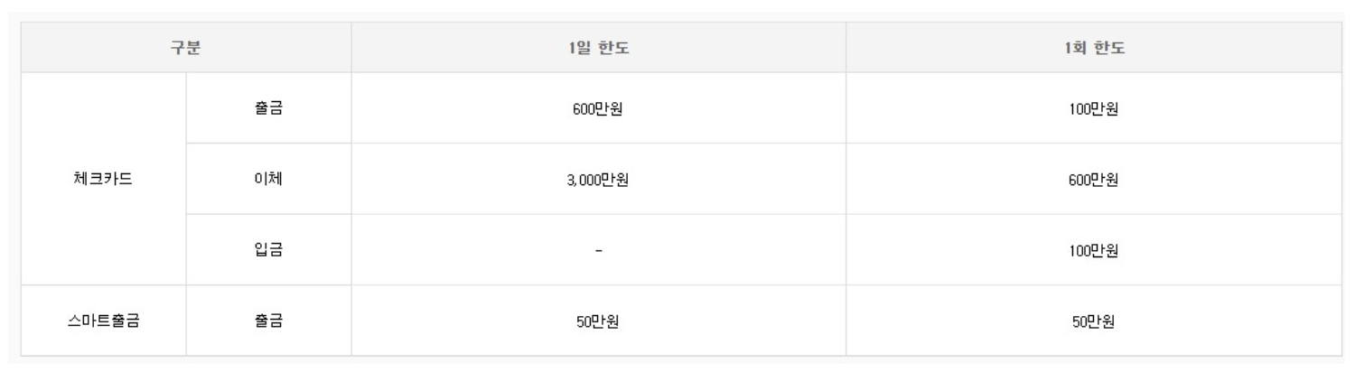 체크카드가 있다면 출금 한도는 하루 600만 원까지 늘어납니다. 이체의 경우에도 하루 3000만 원까지 가능합니다.