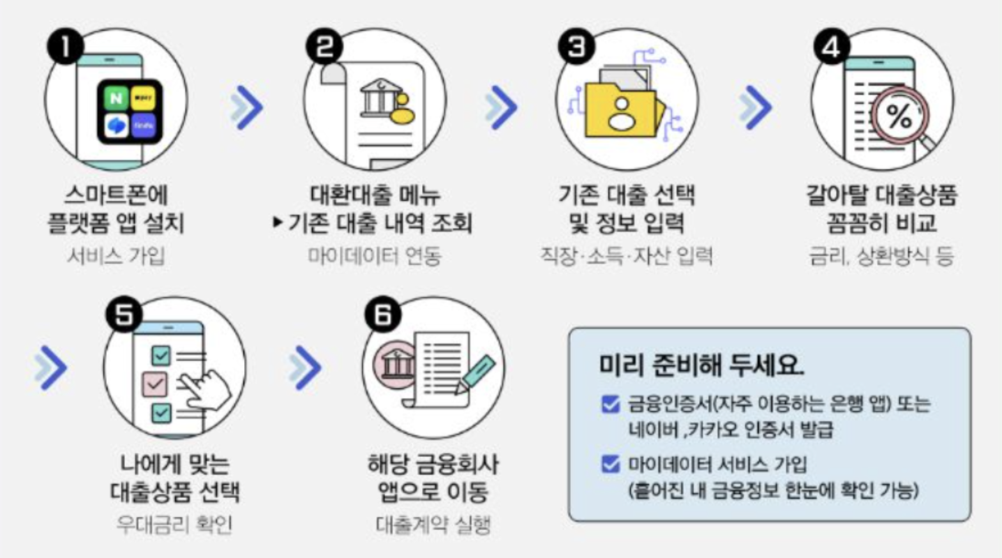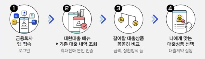 대환대출 서비스란 대출 갈아타기를 말합니다. 내가 현재 대출이 있다면 좀 더 낮은 금리로 옮길 수 있게 되었다는 것입니다. 국가에서 대환대출 플랫폼을 만들어서 은행별로 금리 경쟁을 불붙여서 금리 인하 효과도 기대해 볼 수 있을 것 같아요. 신용대출의 경우에도 쉽게 비교해서 갈아탈 수 있으니 아래의 방법대로 금리가 더 싼 곳이 있는지 확인해 봅시다.