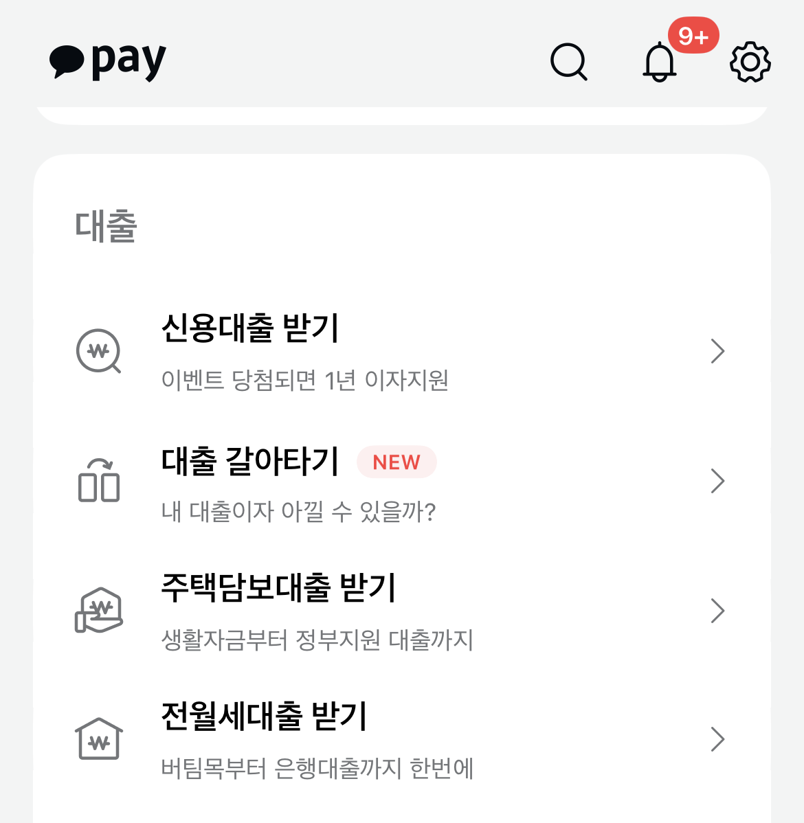 카카오페이 앱에서 확인해보니 아래와 같이 대출 갈아타기 메뉴가 보입니다.
